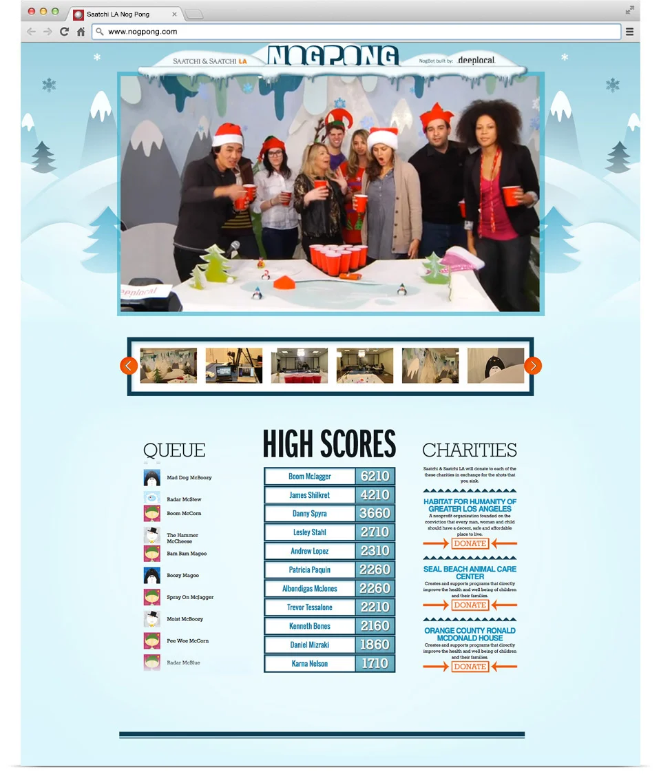 With everyone anticipating boring agency cards for the holiday season, Saatchi LA decided to do something a little different. We created a live event called Nog Pong. Its like beer pong but with egg nog (and a bunch of other booze) and you use a robot to play and there’s a variety show happening behind your cups. With the help of Deep Local, players were able to control the robot (a modified ping pong practice machine) over the web, and for every ball they made we donated money to charity.